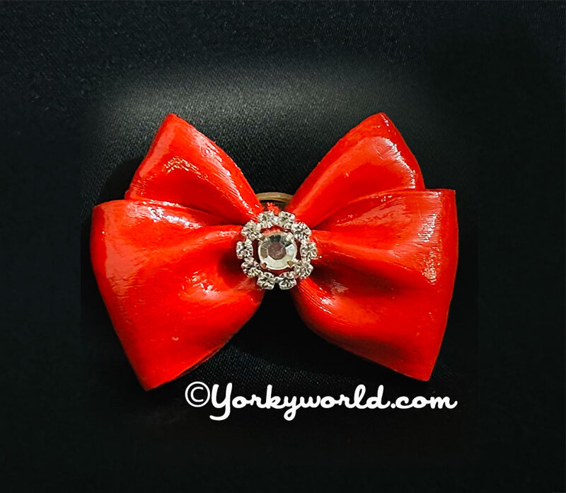 Handmade Bow in red ribbon, artistically treated with a plastic effect and with central strass. (size about 4,5 cm)